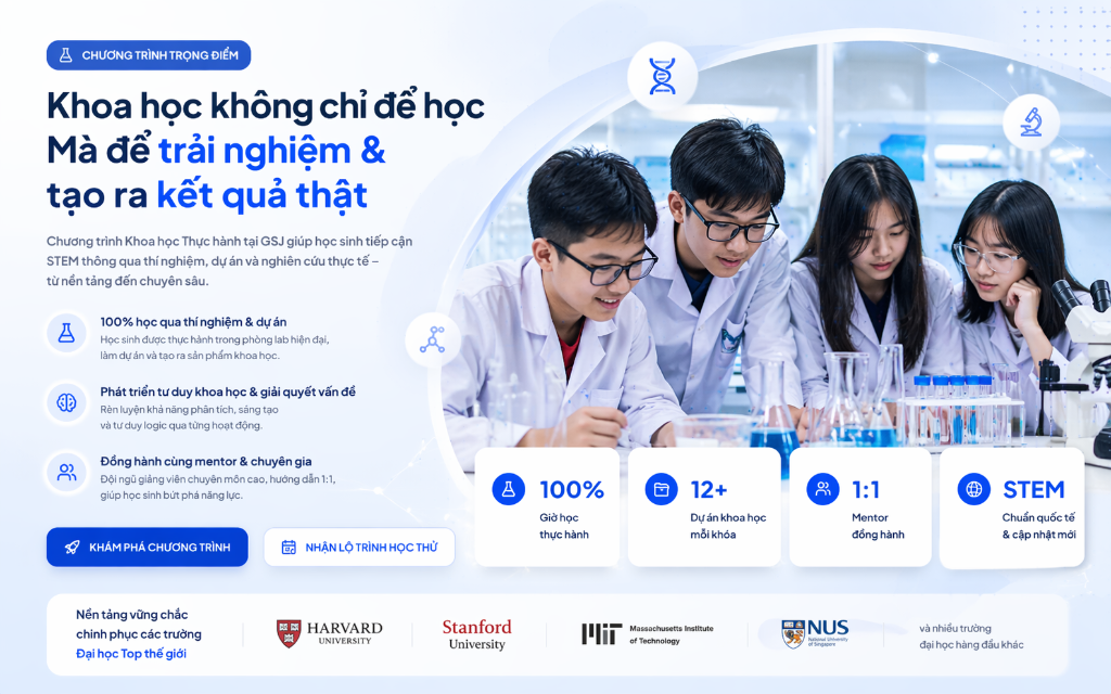 Chương trình Khoa học Thực hành tại GSJ giúp học sinh tiếp cận STEM thông qua thí nghiệm, dự án và nghiên cứu thực tế – từ nền tảng đến chuyên sâu.